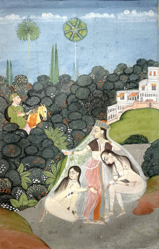 Miniature painting on paper representing a nobleman suprising a group of bathing ladies.