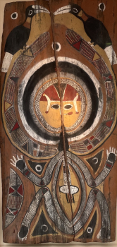 Panggal painting, painted on the spathe of the sagopalm, representing a seated ancestor figure and two spirit birds